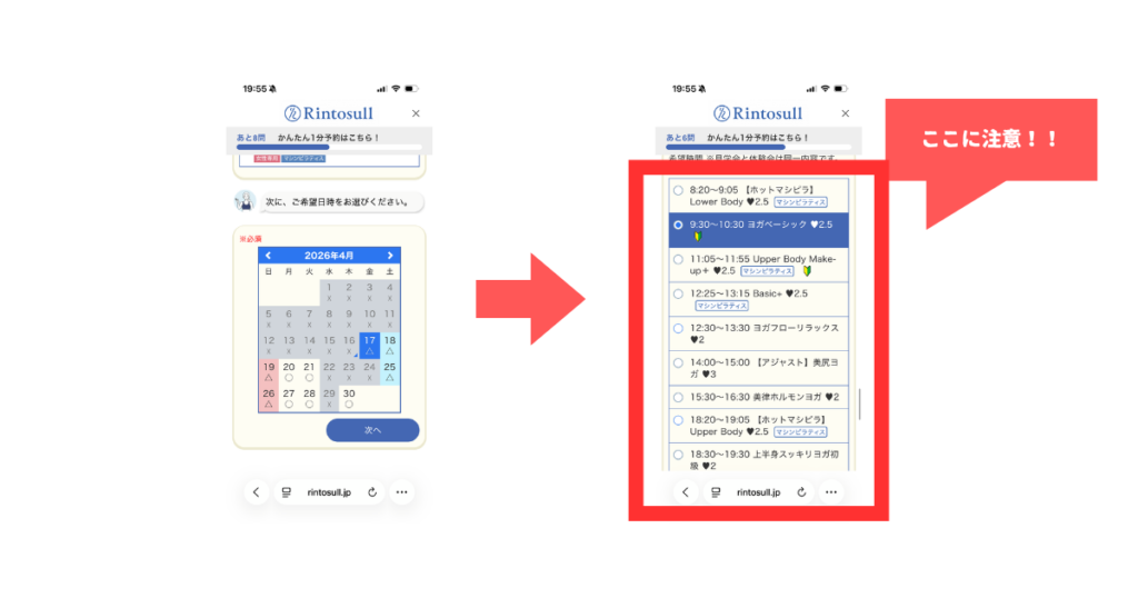 そういった店舗では、体験日時の選択時にヨガも現れるので要注意です。